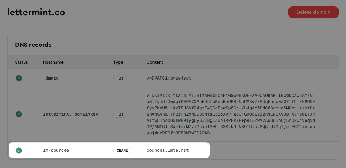 The CNAME target points to Lettermint's bounce handling infrastructure, which includes our SPF record:
